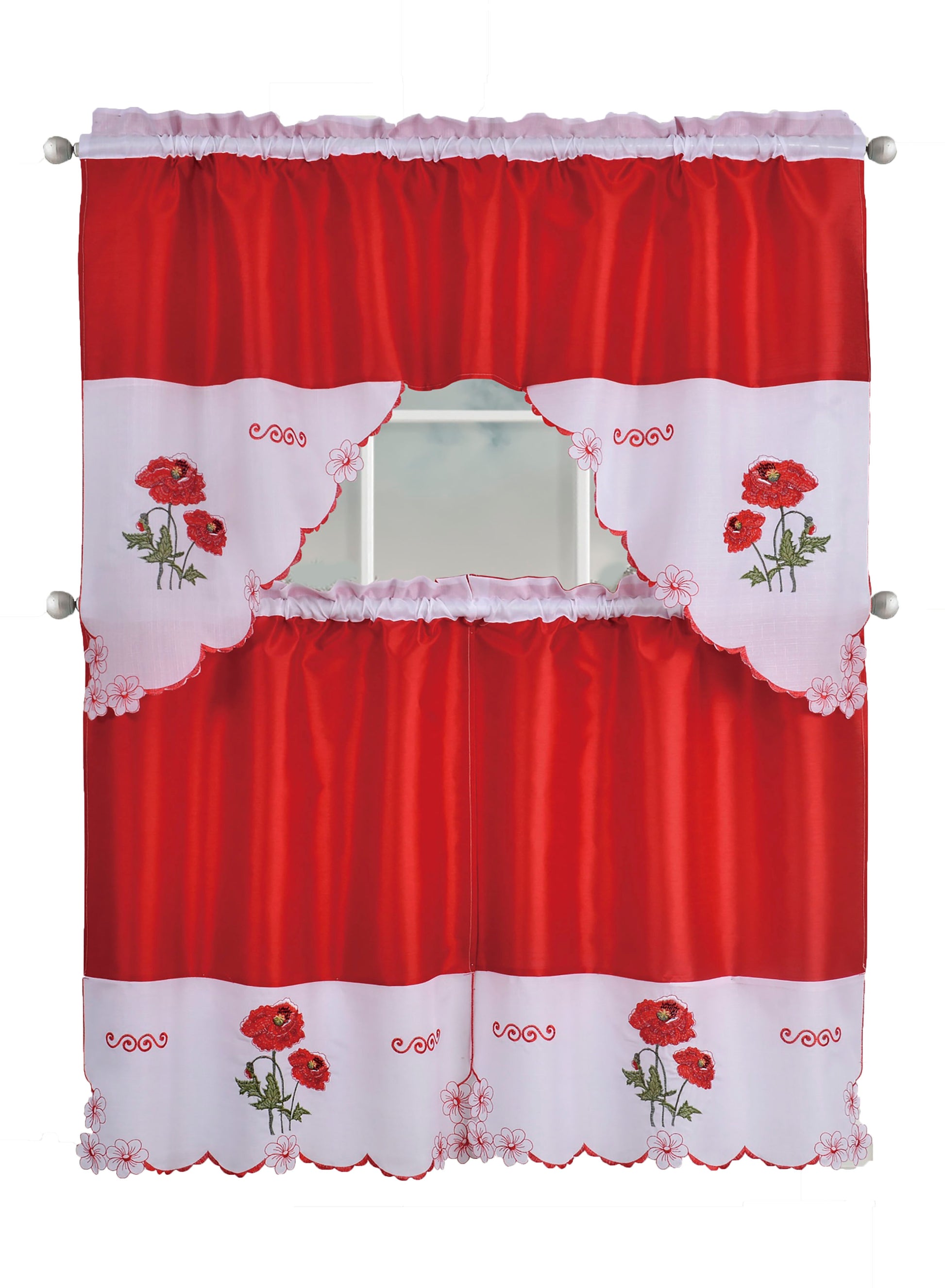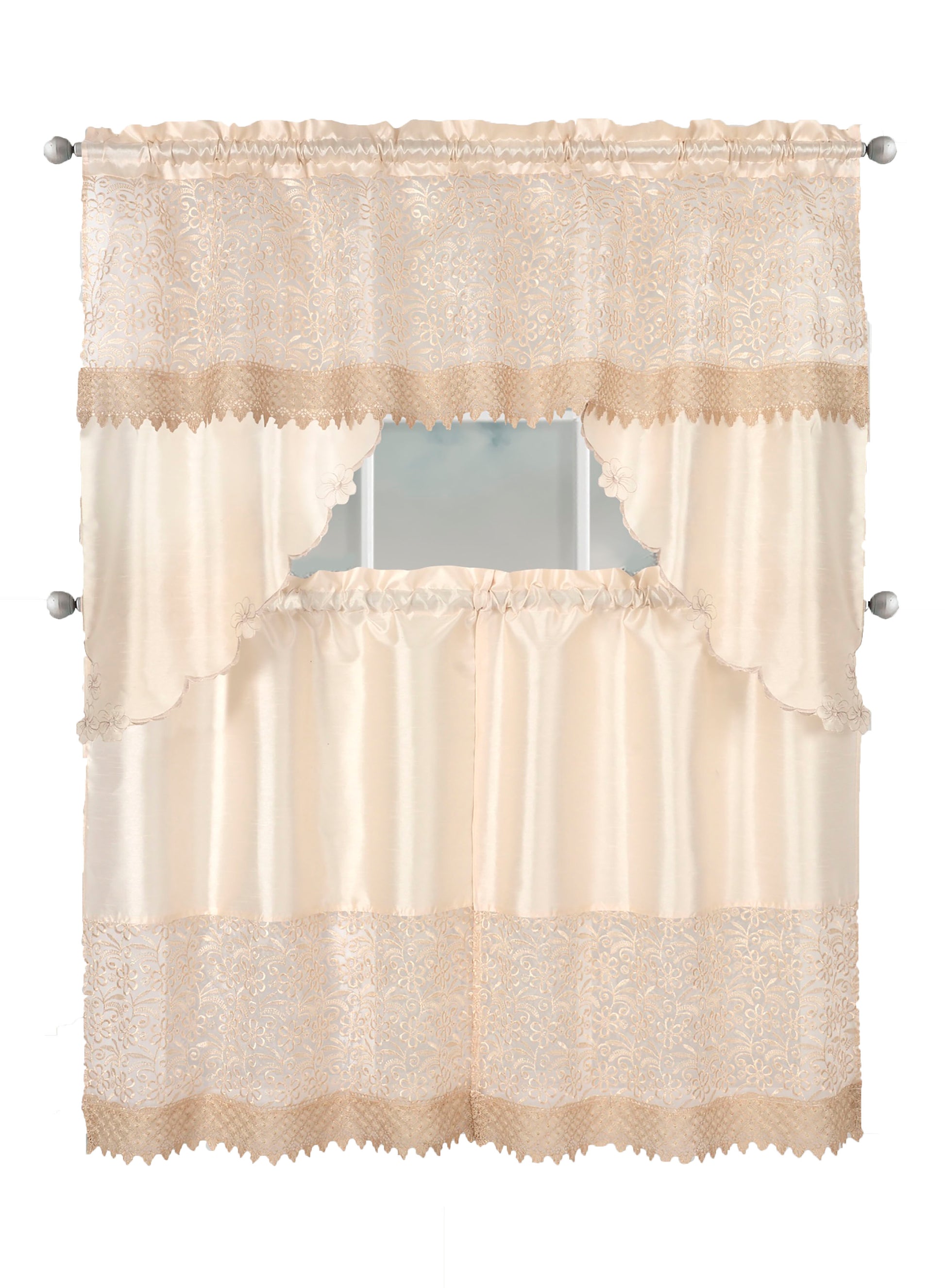 Kitchen Curtains, Part 3 Embroidered Rod Pocket Window Tiers & Swag Valance- 3PC Kitchen Curtain Sets.